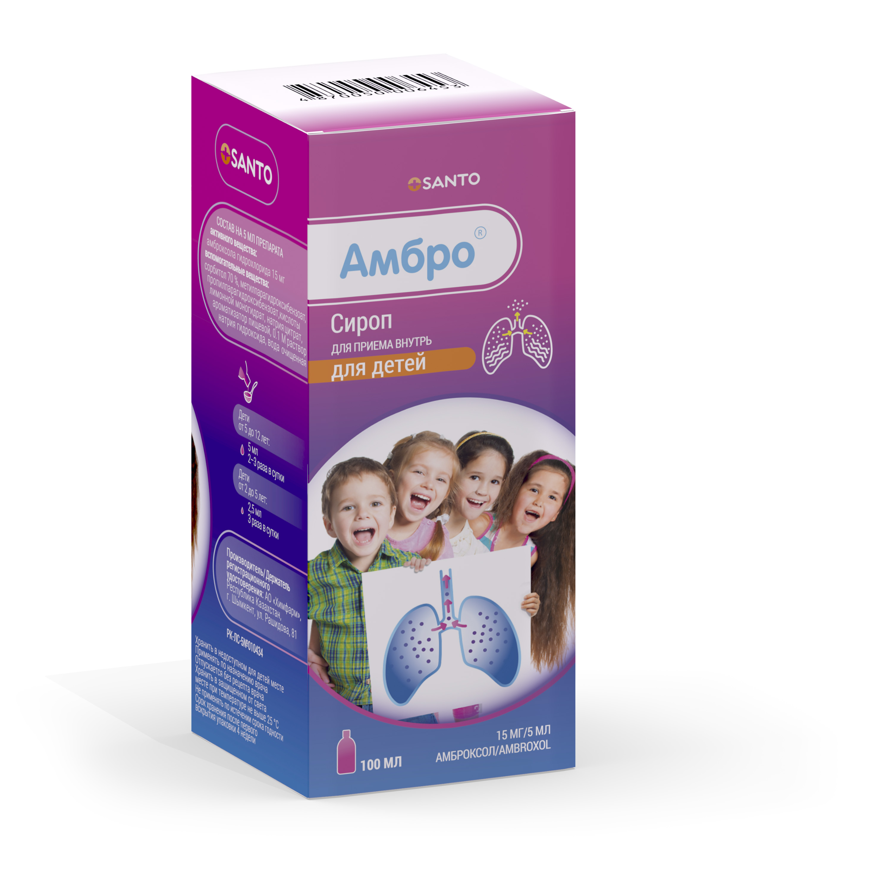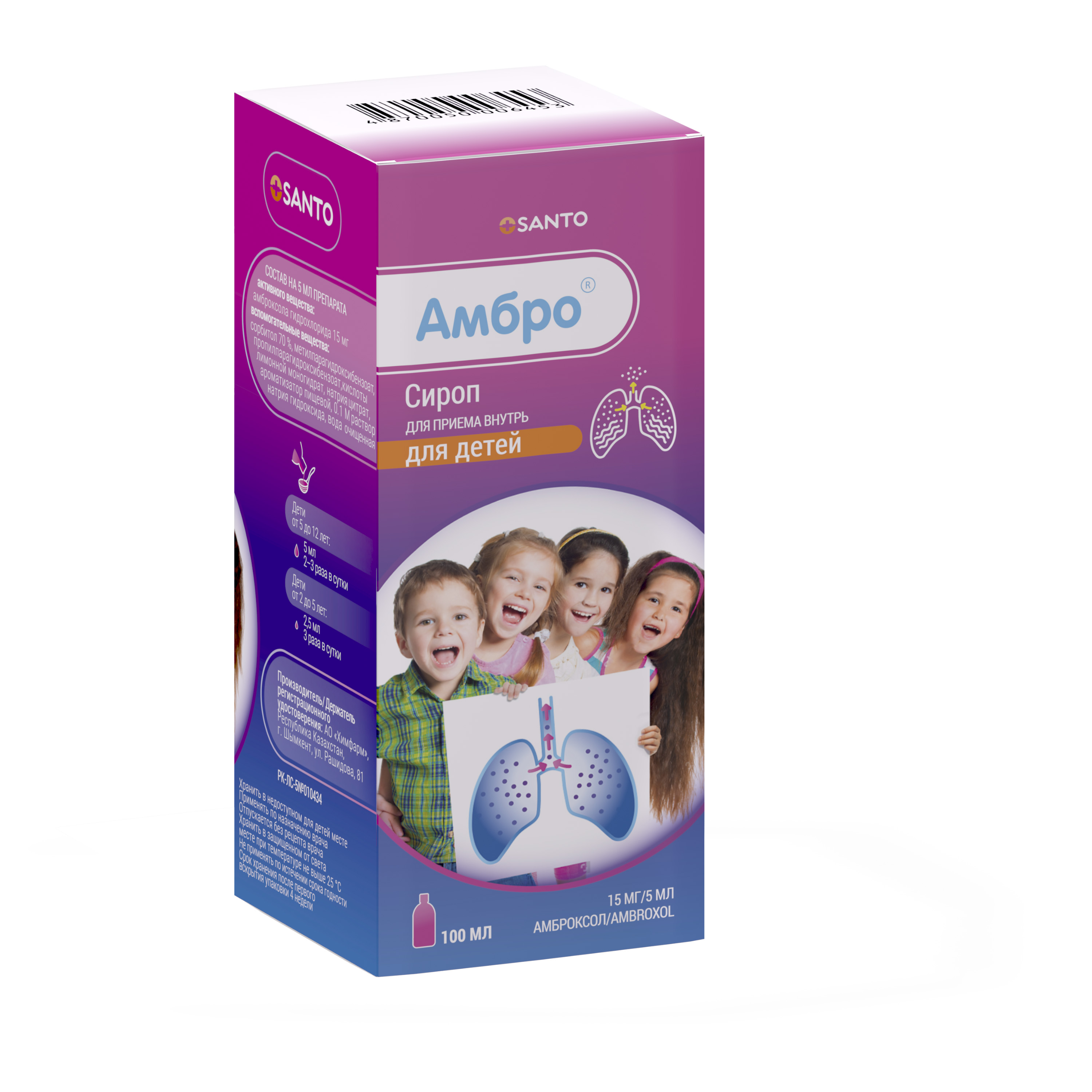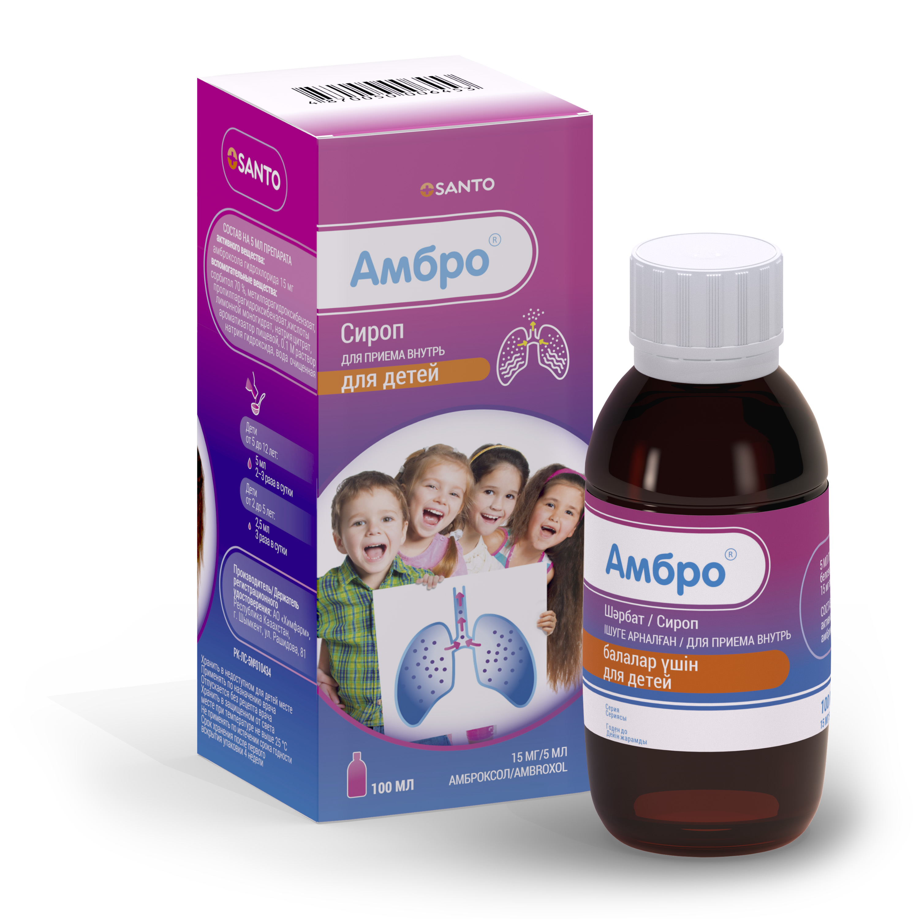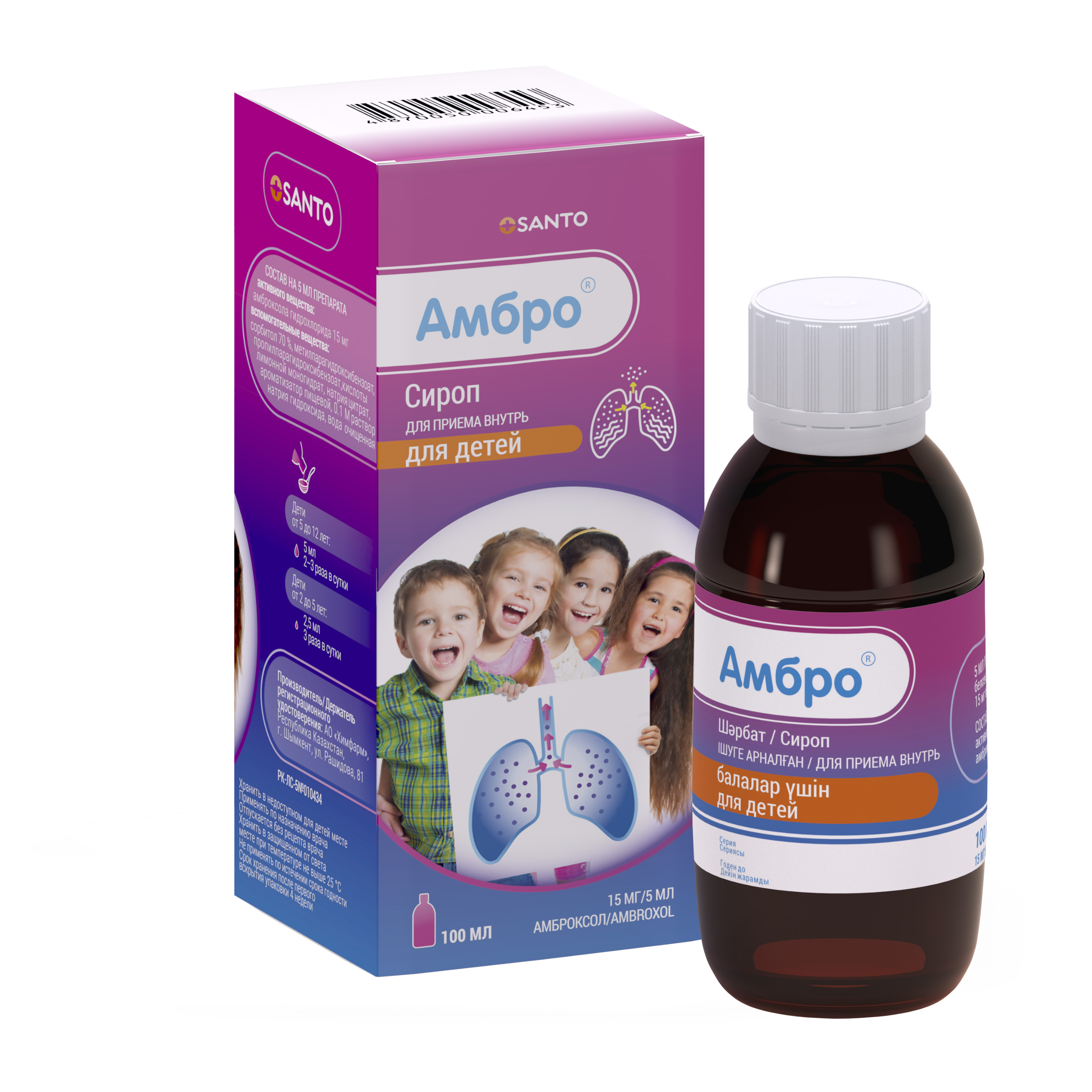 2 жасқа дейінгі балалар тәулігіне 2 рет 2,5 мл-ден қабылдайды (тәулігіне 15 мг амброксолға баламалы).