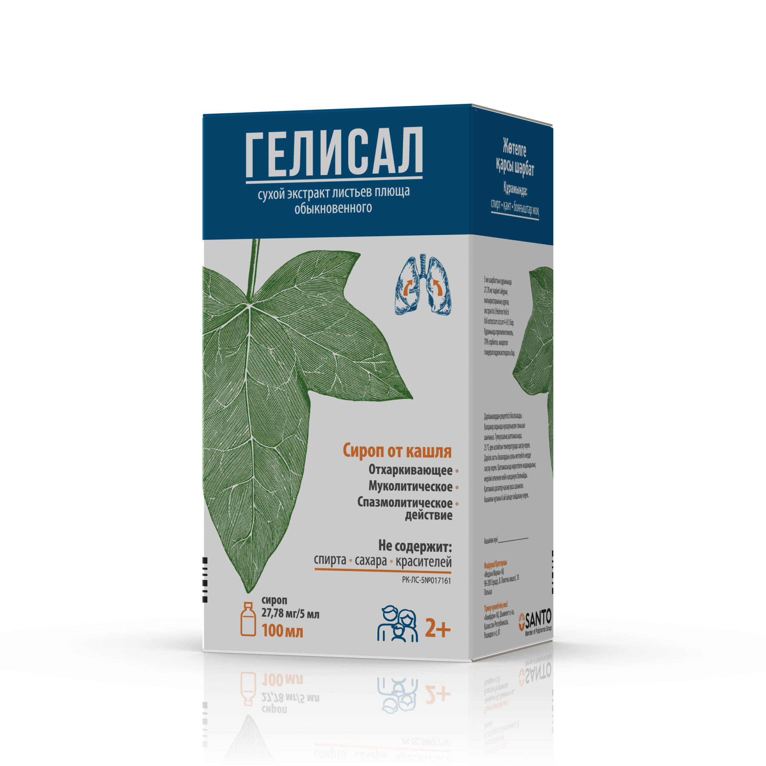 Препарат ГЕЛИСАЛ – лекарственное средство растительного происхождения, которое содержит активное вещество – экстракт листьев плюща. Оказывает отхаркивающее, муколитическое действие и слабое спазмолитическое действие на гладкую мускулатуру бронхов. Основой спазмолитического действия является парасимпатолитический эффект гликозидов (сапонинов), активизирующих β-2 рецепторы в мышцах бронхов и эпителия легких. Это приводит к снижению внутриклеточного Сa2+ в мышцах бронхов и их расслаблению. Одновременно альвеолярные клетки II типа продуцируют больше сурфактанта. При непродуктивном (сухом) кашле способствует разжижению вязкой мокроты, облегчает ее отхождение. При продуктивном (влажном) кашле облегчает отхаркивание и выведение мокроты. Благодаря освобождению дыхательных путей от мокроты способствует улучшению дыхания, уменьшению и исчезновению кашля.